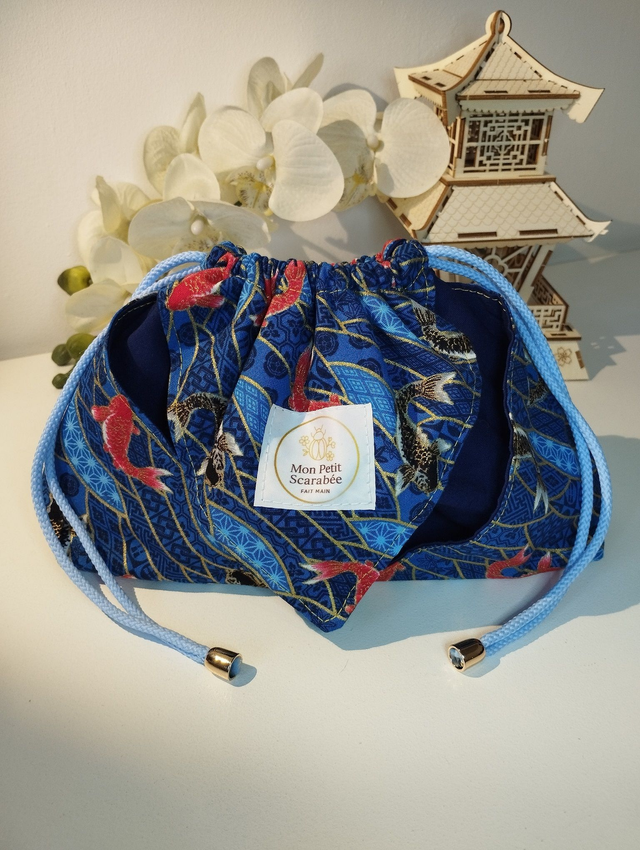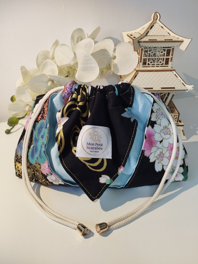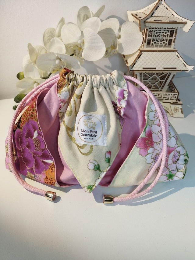Joli sac à cordons type "pochon" fabriqué façon Origami au motif raffiné.